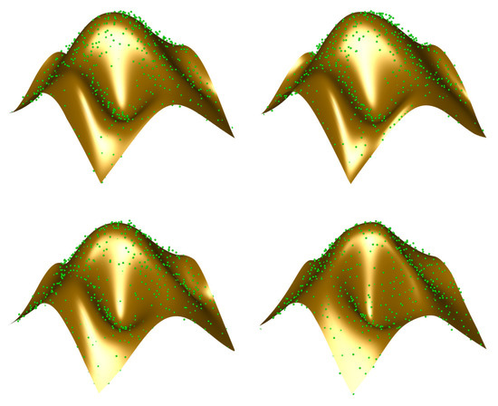 Obviously, solving this problem (4) or (5) in the general case requires computing all free variables, i.e., poles (for , ), and parameters and associated with data points (for , ) for the case of organized points, or parameters and associated with data points (for ) for the unorganized case, of the approximating surface. It is clear that, since each blending function in Equation (3) is nonlinear in and , the system (4) is also nonlinear. It is a continuous problem as well, since all parameters are real-valued. In other words, we have to solve a highly nonlinear multivariate continuous optimization problem. The problem is also known to be multimodal because there could be several optima of the target function. Unfortunately, the classical optimization techniques cannot solve this problem in all its generality. Clearly, more general optimization methods are needed. This paper overcomes this limitation by applying the cuckoo search algorithm described in next section.