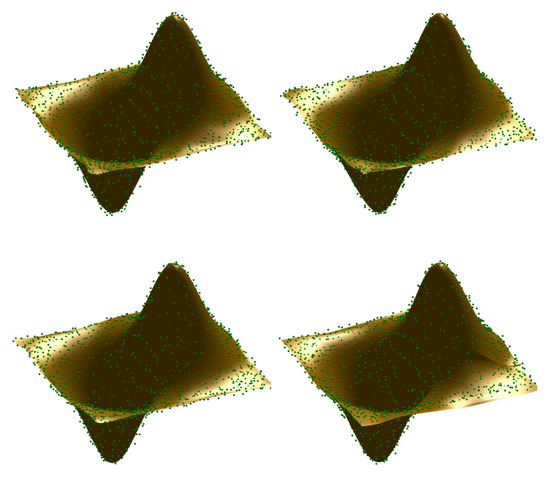 where are vector coefficients called the poles, and and are basis functions (also called blending functions) belonging to given families of linearly independent functions. A typical example of global-support basis functions is given by the canonical polynomial basis: , where , for ; ; ; and . Other examples are, for instance, the Hermite polynomial basis functions, the trigonometric basis functions, or the radial basis functions [4,5]. If the functions , , and are polynomials in u and v, S is called a polynomial parametric surface. The degree of in variable u (resp. v) is the highest degree of the polynomials , , and in u (resp. v).