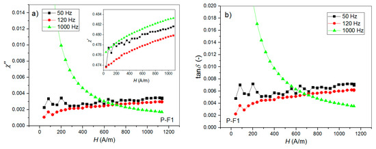 The dependence of the real and the imaginary parts of the susceptibility (a, c, e), as well as the magnetic loss tangent (b, d, f) versus the intensity of the magnetic field (at frequencies of 50, 120, and 1000 Hz) obtained for P-F composites, are presented on Figure 9. In the case of P-F1 and P-F2 samples, a similar dependence was observed. On the contrary, for the PF-3 sample, the magnetic loss at low frequencies was much higher.