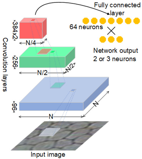 The network used in this work consists of four main layers: The first layer accepts an image, which goes through a convolution stage, that has 96 filters of resolution with padding. The acquired activations are transformed then with ReLu function, followed by cross-channel normalization () and finished by max-pooling transformation with stride 2. The second layer consists of similar set of processing units, where only the number of convolution filters is set to 256 and processing window resolution is set to . The third layer keeps working using a window and 384 filters for convolution stage which is followed by the ReLu nonlinear function. This pair is repeated twice and followed by another max-pooling transformation. Finally, the fourth layer consists of fully-connected network accepting 64 entries, ReLu function followed by dropout with 0.5 parameter value. Then the final fully-connected layer and softmax function are implemented. Figure 2 depicts the network architecture.