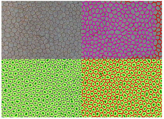 Visualization of achieved segmentation result when three classes were distinguished. Top-left: Original image. Bottom-left: intensive green color denotes cell centers, light green shows which pixels belong to cell body class, while transparent regions denote cell borders. Bottom-right: red color marks cell borders delineation—the same which is transparent on the left. Top-right: pink color shows where the automatic delineation overlaps the manual mask, blue is for the manual mask and red for the automatic one.