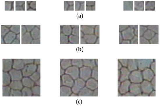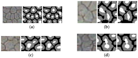 Another aspect of experiment preparation is the spatial resolution of the training sample (see examples presented in Figure 6). The region of interest is rather small when the border is analyzed (usually it should not be greater than ). It grows larger with the cell center definition, but still the spatial resolution of seems not justified. Therefore, two additional networks using and patches were evaluated. The change of input data resolution affects the network architecture. It was assumed that the 64 element vector fed for the last feed-forward layer should not be shorter. The number of pooling translation of the input data had got to change. In consequence for the network of , the last pooling layer was removed from the CNN. While in the case of the third and fourth layers were exchanged with a new one consisting of two convolutional kernels (of 256 and 384 filters respectively) followed by ReLu layer. Additionally, the resolution of convolutional and cross-channel filters were set to . The visual inspection of examples presented in Figure 7 shows that when the sample size is small, it becomes difficult to correctly detect cell centers. This is probably the outcome, of variable cell size, and for larger cells, more pixels seems more adequate. In the contrary, when the sample size is large, it is more difficult to detect cell borders correctly. It might be, however, the result of the first convolution filter size, which in this case is unlike in other cases. The correct classification ratios obtained for ten times cross-validation approach are 86.37%, 87.54%, 87.65% calculated for sample size respectively 16, 32, and 64. Since the results are comparable for the larger patch approaches, it can be concluded that the best sample resolution is due to its smaller size with similar classification accuracy—that supports the visual inspection finding.