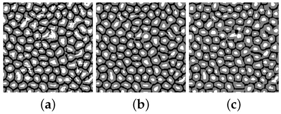 Segmentation outcomes for networks trained with a different spatial resolution of samples: (a) Side size 16; (b) Side size 32; (c) Side size 64. The white color is for cell center class; gray for cell body; and black for cell border.