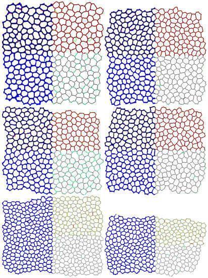 where stands for true positive—those pixels which are the delineation in the computed set of cell borders and in the original mask; is false positive—elements which were recognized as a borders by mistake; and —these parts of image which should have been categorized as cell borders, but were wrongly marked as other class. Another method of mosaic comparison is by calculation of the distance which is between its two realizations, when pixels belonging to it are understood as a set of points and the number of points k may vary between compared objects. The modified Hausdorff distance (MHD) introduced by [39] is such a metric which enables calculation how far a set of data is from the . Its definition is given with following equations: