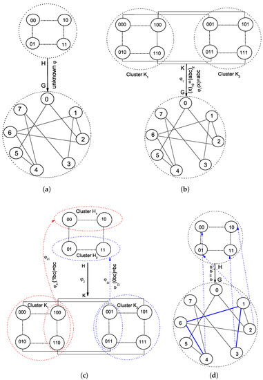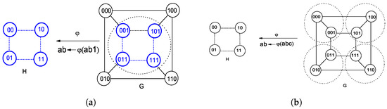 From a mathematical viewpoint, one can find to embed K to G, and to embed H to K, so as to obtain the final to embed H to G, by merging and as . It should be noted that the two structures related to are relatively changeless and of the other ones related to , generally, the larger one remains static. Thus, the total time complexity of deriving and maybe less than that of deriving directly. As shown in Figure 3, we obtain a generalized subgraph homomorphism in Figure 3a and isomorphism in Figure 3b to model the abstract embedding of H into G, relying on the regular static hypercube topology.