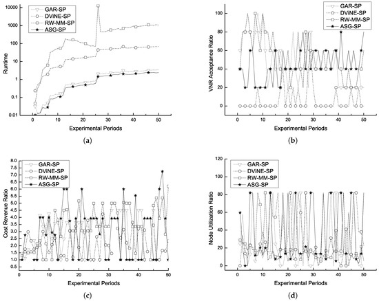 On the randomly generated SN, SAG-SP generates a highest average VNR acceptance ratio , lowest average cost/revenue ratio , and the second largest average node utilization ratio compared with the other three algorithms, as listed in Table 3 and Table 4. More broadly, Figure 3a,c,d demonstrates that SAG-SP produces more competitive values with regard to three VNE evaluation metrics than the other three approaches. The only exception being that SAG-SP lags behind DViNE-SP in node utilization ratio. This anomaly is probably due to the fact that DViNE-SP, as the exclusively optimization-based VNE approach being tested achieves an exact solution from its objective function that assigns SN resources to VN more precisely. On the other hand, we also notice that sometimes the experimental results yield unstable distributions in terms of cost/revenue ratio and node utilization ratio in the case of the Fat-tree SN. In this regard, our future research plans include attempts at understanding how topological features of SN affect stability in our algorithm, so that we can fine-tune it to behave more stably on fat-tree class networks. Overall, our algorithm is capable of trading off performance and quality better than other approaches, including for fat-tree SN.