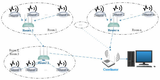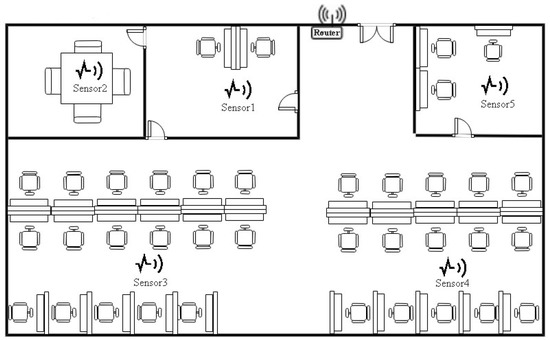To illustrate the working principle of ZigBee, an architecture of WSNs in a building is displayed in Figure 1. One or more sensors can be installed in a single room, and each of them can only communicate with its nearest router. The router is placed along the corridor or within a room according to its signal overlay area, and it is able to send signals to its neighbor router or the coordinator. A coordinator transmits data to a computer by interfaces, then data is processed in the computing center for further analysis. Figure 2 presents a typical room from Data Analytics and Collaborative Computing (DACC) Laboratory [24] is equipped with sensor network devices, and each independent space has a sensor. Here it is necessary to remark that the number of required sensors depends on the size of the room and the range of sensing.