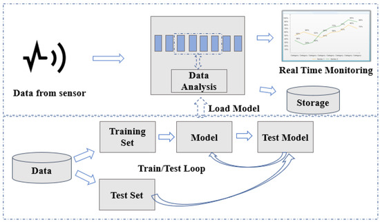 After obtaining data from coordinators in WSNs, we need to mine potential valuable knowledge from these raw data, like occupancy counting and safety level. The Data Analytics Module consists of two parts, the off-line model building and the online data analysis. The off-line model building uses an extremely large amount of data to train/test data. Various machine learning algorithms can be applied in this step for the purpose of finding an optimal model to predict new data. This procedure usually lasts for a long time or needs to be done repeatedly so as to find the best parameters. The on-line prediction step processes real-time sensing data transmitted to the computing unit. Firstly, the model obtained from the previous step will be loaded. Then the model is applied to evaluate the room state and estimate the occupancy. Finally, these results will be sent to a display for monitoring or storage for further application. The reader is referred to Figure 3 for illustration.