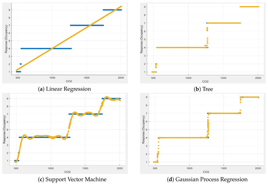 The response chart of (a) Linear Regression; (b) Tree; (c) Support Vector Machine; and (d) Gaussian Process Regression.