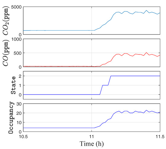 Figure 9 depicts the input CO and CO concentration with output estimation of occupants and state. In this case, both CO and CO are under safe threshold from to They increase steadily from to which simulate an abnormal occasion (potential fire). By using the linear model (2), the output prediction of occupancy shows a similar trend as CO concentration. However, when abnormal events occur, the CO content is extremely high which may be less meaningful to use it for occupancy calculation. The state evaluation is more likely to depend on toxic gas, thresholds affect when to start warning.
