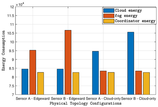 Table 6 gives configurations of fog devices. There are three types of devices including coordinator, data analytics and Cloud. They have attributes including CPU, RAM and POWER. According to [25], the CPU, and ram of Cloud VM is given as and , respectively. The maximum and static powers are set as and , correspondingly. The fog device, data analytics, have the same configuration. Coordinator is configured with less computing capacity and power. In ifogSim, computing power is described by MIPS. The correlation between GHz and MIPS also relates to clock cycles per second. According to [28], the fog devices are allocated with at and at . The transmission speed is set to downstream and upstream. Table 7 shows the description of network links used to build the communications between source devices and destinations, where the latency time is specified. Notice that the latency of connecting with the Cloud is much larger. Table 8 shows the parameters of sensors. Inter-arrival time represents the time interval to send/collect sensor data. Two types of sensors are configured with different inter-arrival time.