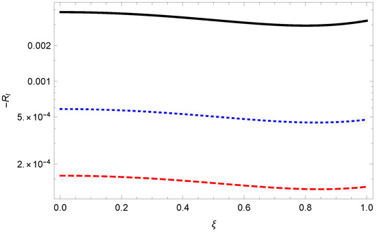 The ratio of the remaining contributions to the energy relative to the lowest order approximant, , for isorefractive dielectric-diamagnetic balls. Plotted are the negatives of this ratio for (solid, black), (dotted, blue), and (dashed, red).