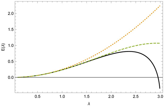 Energy estimate for a diaphanous ball (in units of ) based on the leading terms in the UAE as a function of the coupling . Plotted is the exact approximant (solid curve), the contribution of the leading order (with the divergence removed) (dotted curve), and the sum of the first two leading orders (dashed curve). Although the exact approximant is finite at , it possesses an infinite slope there, having changed sign for a slightly smaller value of .