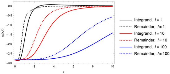 The integrand of the energy given by Equation (26) for and , shown by the dotted lines. The solid lines show the unsubtracted integrand. The removal of the leading UAE contributions greatly improves the behavior of high x values, but leaves large and growing contributions for moderate values of x.