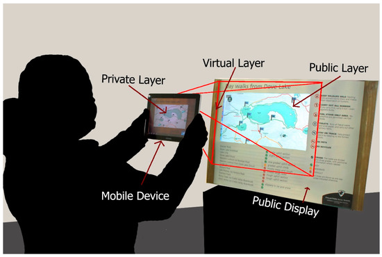 Based on the need to link two different screens, i.e., the public display and the mobile device screen, we designed for three different layers of information visualization (see also Figure 1)—the public layer, virtual layer, and private layer. Our conceptual model was based on the model of Lee et al. [21] for various screens that not only visualize information individually, but also allow for layers of visualization that work together and complement each other to form a single information/virtual space.