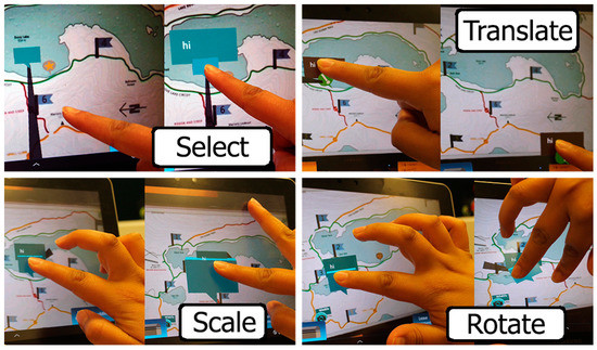 At the center of the screen (in Figure 3 area (4)) is the touch input area. It is where the content manipulation interaction technique occurs and users use common touch input gestures to interact with the public display content. The available interaction techniques in the prototype are shown in Figure 4; these are: one finger touch and select, one finger drag and translate, two fingers scale, and two fingers rotate.