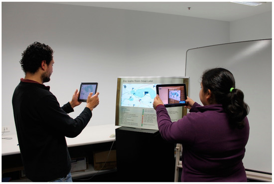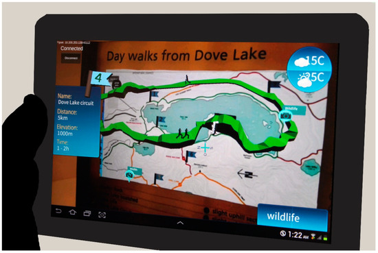 A total of 40 participants (22 males, 18 females; age range 19–58; mean age 24.5 years) participated in the study. Most of the participants were computer science students, but some were also community members interested in testing a new way to control and interact with public displays. The participants were asked to come with a friend, and each pair was randomly assigned to either the traditional group (which used a static public display) or the mobile group (which used the proposed 3D mobile interaction prototype). The participants were asked to role-play as two tourists that want to spend the day hiking and taking pictures of Dove Lake at Cradle Mountain National Park and to plan their route with the given tools.
