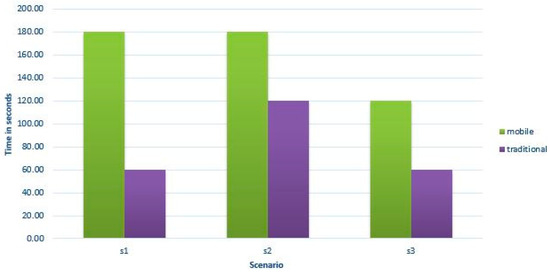 To measure engagement, the time spent doing each scenario for each group was analyzed. In scenario 1, the mean between mobile groups and traditional groups is 2.65 with a standard deviation of 1.531. In scenario 2, the mean between mobile groups and traditional groups is 3.10 with a standard deviation of 1.861. In scenario 3, the mean between mobile groups and traditional groups is 2.10 with a standard deviation of 1.252 (Figure 8).