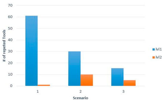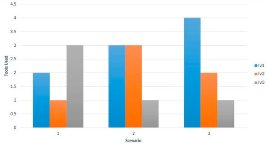 We used the correlation of the previous results with the participant’s repetition pattern for the tools in each level to show us the novelty of the user interface. The tool repetition pattern is illustrated in Figure 10. On average for the three scenarios, participants used Level 1 tools 35.5 times, and for tools in Level 2, participants used them 5.3 times on average (Figure 10).