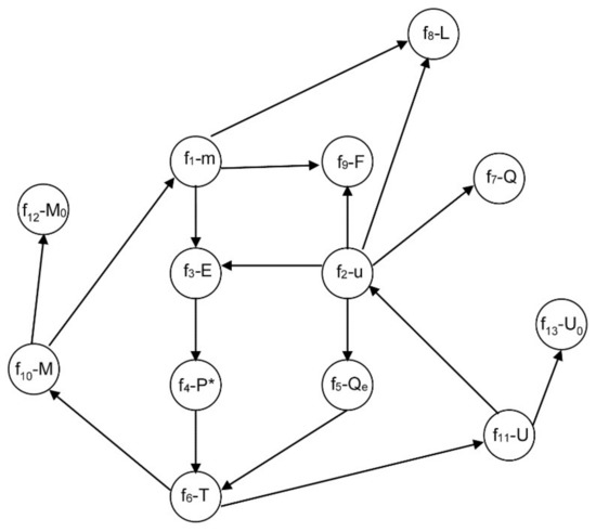 Each variable is assigned to the equation in which it is solved. Therefore, the system causality is {f1-m, f2-u, f3-E, f4-P*, f5-Qe, f6-T, f7-Q, f8-L, f9-F, f10-M, f11-U, f12-M0, f13-U0}. All this information is collected into an equation-variable directed graph where every node is labeled as “equation-variable”, as it is shown in Figure 3. An edge goes from node 1 to node 2, if node 2 computes a variable which also belongs to the equation of node 1.