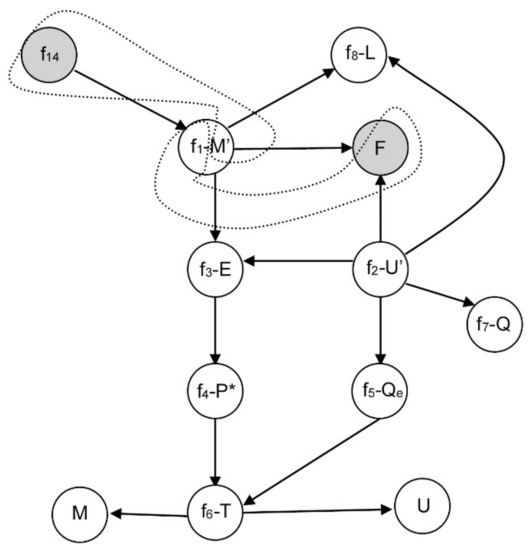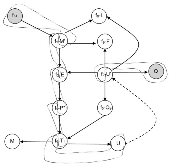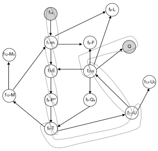 Let us suppose that M is constant again; however, the equation f7 is selected to be removed from Equation (7). This is equivalent to relax the design variable Q, which means that the design variable Q turns into an unknown algebraic variable. The changed equation-variable assignments are given by: f14-m, f1-E, f3-P*, f4-T, f6-U, f11-u, f2-Q, as shown in Figure 5. Sorting the equations and highlighting the variables that are computed by each equation in square brackets, the new system can be written as in Equation (9).