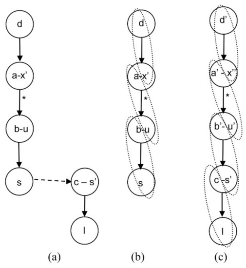 The second possibility consists of linking equation d indirectly with the selected design variable I through the state variable s, see Figure 8. There is a differential edge from node s to node c-s′ represented as a dashed arrow. In this case, an index reduction algorithm, such as Pantelides’ algorithm [10], must be applied. This algorithm shows that the path from d to node s must be derived. Equations involved in this path must also be derived. The new system causality is shown in Figure 8c. Thus, in this situation, the differential index is higher than one.