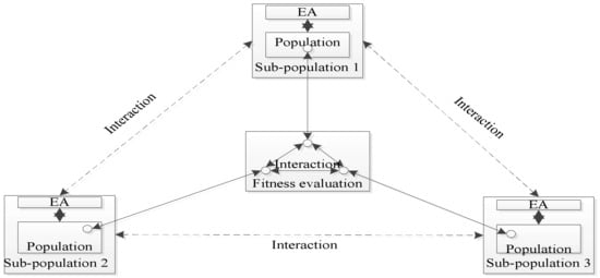 The framework of the CEA includes three sub-populations in Figure 1. The individuals in each sub-population implement the corresponding evolutionary operation by using different evolutionary algorithms. There exists the interrelation and interaction among sub-populations, and each sub-population is independently evolved by the evolutionary algorithm in order to search for the optimal solutions.