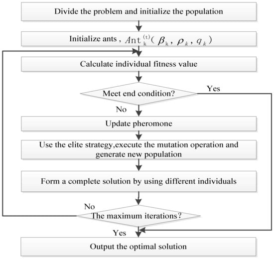 According to the co-evolution idea, hybrid mechanism, multi-population strategy, elitist strategy, and min-max ant strategy, the flow of the proposed SCEACO algorithm is shown in Figure 2.