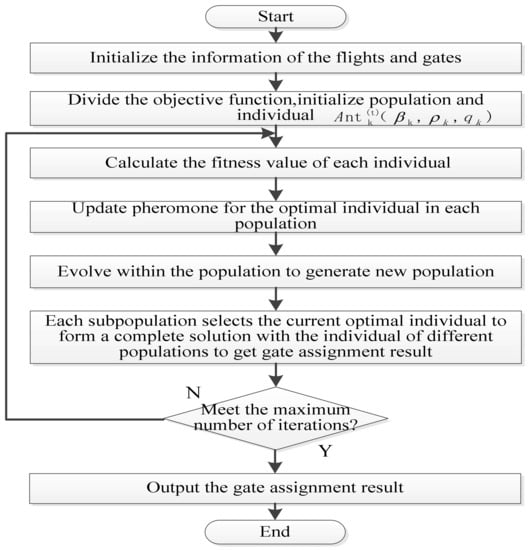The proposed SCEACO algorithm with global optimization ability is used to solve the multi-objective gate assignment model of a hub airport. The solving flowchart is shown in Figure 3.