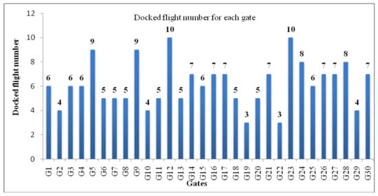 The SCEACO algorithm is used to solve the gate assignment model of a hub airport. The experiments were continuously carried out 20 times for solving the gate assignment model. The best time of the 20 experimental times was selected to analyze the effectiveness of the SCEACO algorithm and gate assignment model of a hub airport. The optimal objective value is 0.3160. The obtained assignment result for each gate is shown in Table 3 and Figure 4.