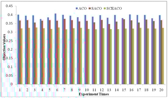 As can be seen from Table 4 and Figure 5, in the results of 20 experimental times, the optimal value by using the SECACO algorithm, 0.3160, is better than the ACO algorithm, 0.3755, and SACO algorithm, 0.3471, and the worst value by using the SECACO algorithm, 0.3269, is better than the ACO algorithm, 0.4070, and SACO algorithm, 0.3764. For the average value for the results of 20 experimental times, the average optimal value by using SECACO algorithm, 0.3213 is better than the ACO algorithm, 0.3930, and SACO algorithm, 0.3649. Therefore, the experiment results show that the proposed SECACO algorithm takes on a more outstanding optimization ability and better performance in solving the gate assignment problem. As can be seen from the number of iterations in Table 4, the average number of iterations by using the SECACO algorithm, 52.85, is less than the ACO algorithm, 105.5, and SACO algorithm, 78.4. Therefore, the experiment results show that the SECACO algorithm can obtain the optimal objective value faster than the ACO algorithm and SACO algorithm in solving the constructed gate assignment model of a hub airport. That is to say, the solution quality by using the SECACO algorithm is the best. The SECACO algorithm can effectively improve the comprehensive service ability of the gate assignment and takes on a more outstanding searching ability and faster optimization ability. The SECACO algorithm provides a new method for solving the complex optimization problem.