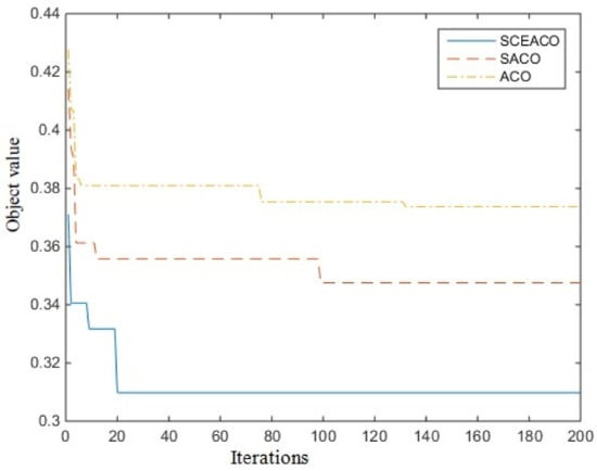 As can be seen from Figure 6, for solving the gate assignment model of a hub airport, the target value of the first iteration by using the SCEACO algorithm is superior to the ACO algorithm and SACO algorithm. When the ACO algorithm and SACO algorithm are used to solve the gate assignment model of a hub airport, the multi-objective function is established according to the gate assignment model of the hub airport in order to obtain the fitness value of each individual. When the fitness function is solved, the weights of each objective function also need to be considered. In this study, the SCEACO algorithm divides the optimization problem into several sub-problems in order to avoid the effect of the optimization problem. As can be seen from Figure 6, the SCEACO algorithm can obtain the optimal value in nearly 20 iterations. The convergence speed is obviously faster than the ACO algorithm and SACO algorithm. The mutation within the population can adjust the combination of parameters of the SCEACO algorithm in order to obtain a greater chance to search for a better path, which also reflects that the SCEACO algorithm has a more effective searching ability. Therefore, the SECACO algorithm can effectively solve the complex optimization problem and takes on a more outstanding searching ability and faster optimization ability. It provides a valuable reference for solving the complex optimization problem.