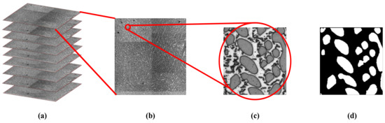 Microscopic images of AL–La alloy. (a) Stack of serial sections (nine slices or images) for Al–La alloy with an interval of one micrometer. For clarity, we painted the edges of the slices red; (b) one of slice with resolution of 3200 × 3200; (c) Details of micrograph with resolution of 200 × 200; (d) Manual segmentation for (c).