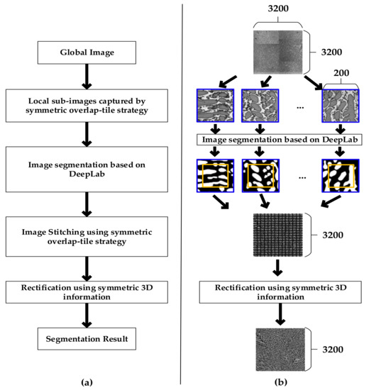 Figure 2 shows an overall flowchart of the proposed image segmentation method. Firstly, considering the limit of GPU resources, we clipped the high resolution global image into sub-images based on the symmetric overlap-tile strategy. Secondly, we applied DeepLab to segment local sub-images. Thirdly, we stitched the segmentation results by using the symmetric overlap-tile strategy. Finally, we used symmetric rectification to further enhance the performance of our results.