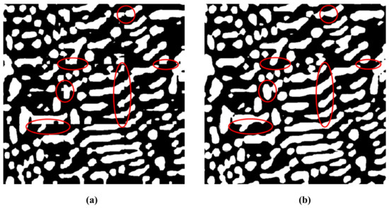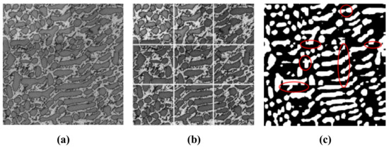 The quantitative analysis of microstructures is essential in the control the properties and performances of metals or alloys [1,2]. An important step in this process is microscopic image processing [3] which is used to extract significant information in a microstructure [4]. A sample of dendritic microstructure in a hypereutectic Al–La 35 wt % alloy is shown in Figure 1; (c) is the original image and (d) is manual segmentation result for (c) with the white regions representing the Al11La3 dendrites or the region of interest (ROI); with the black regions representing the background (eutectic phase of α-Al+Al11La3). The traditional fully manual operations to extract the ROI are accurate; however, it is also time-consuming and laborious. Therefore, quick and accurate image segmentation for Al–La alloy’s microscopic imaging is an urgent problem yet to be solved.