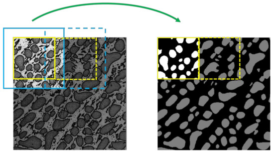 In this study, we used a stack of microscopic images of Al–La alloy as a dataset. Since the field of view captured by a microscope is relatively smaller than the size of the large specimen, we stitched together six small images to form a large microscopic image (one slice) with high resolution (3200 × 3200 pixels). As shown in Figure 1, the dataset included nine slices with two classes; all slices were produced by this method. Among all the slices, six slices were used for training and the other three slices were used for testing purposes. Considering the limited resources of the device, we cut one slice into 256 small images (200 × 200 pixels) which was big enough to contain the detail of one dendrite structure. Traditional data augmentation only considers clip and translation process and rarely handles the rotation process [16,17,18] as it is usually concentrated on the objects in the nature scene. However, rotation of samples is most commonly observed by microscope. Therefore, given data augmentation and the homogeneous property of the material, we applied rotation and flip processes to the original image. After cutting and augmentation of the slices, 12,288 images (200 × 200 pixels) were used for training.
