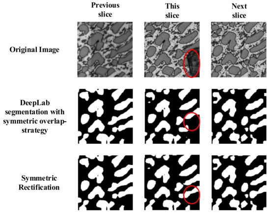 We modified the framework of DeepLab by considering symmetric 3D information and reported the evaluation results in Table 2. In this table, we show the comparisons of the DeepLab based on simple local processing, DeepLab based on symmetric overlap-tile strategy, and DeepLab based on symmetric overlap-tile strategy and 3D symmetric rectification. Experiments showed that these methods could enhance accuracy compared to the traditional DeepLab. The performance of image segmentation is essential for 3D reconstruction and 3D information characterization. Therefore, any improvement of segmentation for material science is important.