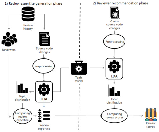 The reviewer recommendation phase consists of two steps: inferring topics of a new source code change and computing the developers’ review scores. In the following subsections, we describe the steps in detail.