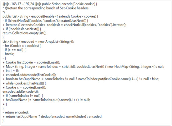 A source code change is human-readable text data that are treated in a way similar to a text document. Figure 2 shows a source code change related to “http header cookie encoding”. In general, frequently appeared words are less important in a text document. For example, words that are prepositions, articles, or conjunctions in English frequently appear in several texts and do not have a specific meaning. Hence, such words are typically treated as stop words in modeling an LDA model [25]. As the stop words, keywords, and operators frequently appear in several source code changes and are not related to any specific functionality of a software, they may affect the results of topic extraction by LDA. Therefore, a source code change needs to be preprocessed before being passed to LDA.