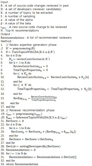 Figure 3 shows the algorithm of the proposed reviewer recommendation approach in pseudo code. The algorithm takes a set of source code changes reviewed, a set of developers, a number of K to be extracted, a number of sampling, the values of alpha and beta for LDA, a new source code change to be reviewed and a number of recommended developers as input, and then outputs a list of recommended reviewers. The body of the algorithm consists of two parts, the review expertise generation phase (from line 1 to line 17) and the reviewer recommendation phase (from line 18 to line 33). In the part of the review expertise generation phase, the reviewed source code changes given as an input are preprocessed (line 2). The preprocessing process is performed as described in Section 4.2.1. Then, the topic distributions of the reviewed source code changes are extracted using an LDA implementation with the values of , , , (line 3). After extracting the topic distributions of the source code changes, the review expertise for K topics are computed for each developer in the set of developers given as an input (from line 4 to line 17). For each topic k, the review contributions of a developer, , is computed based on a set of source code changes reviewed by the developer (from line 9 to line 11) and the total topic distribution, , is computed from all the source code changes (line 12 to line 14). Then, the review expertise of the developer for topic k, , is determined by dividing his/her review contributions by the total topic distribution of topic k (line 15). In the part of the reviewer recommendation phase, the new source code change is preprocessed and then its topic distribution is inferred using an LDA implementation with the values of , , and (from line 19 to line 20). After that, for each developer and each topic k, the review scores of the developers are computed with the topic distribution of the new source code change and the computed review expertise of the developers (from line 22 to line 27). Finally, the developers are sorted by the computed review scores in descending order and top-N developers are selected from the ordered developers as the reviewer candidates (from line 30 to line 32).