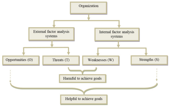 Kotler et al. used SWOT analysis to attain an orderly approach to decision-making [9,10,11]. Many researchers in different fields [4] apply SWOT analysis. An overview of the applications of SWOT analysis is given by Helms and Nixon [8]. SWOT analysis has been applied in the education domain by Dyson [12]. It has also been applied to healthcare, government and not-for-profit organizations, to handle country-level issues [13] and for sustainable investment-related decisions [14]. It has been recommended for use when studying the relationships among countries [15]. SWOT analysis is mainly qualitative. This is the main disadvantage of SWOT, because it cannot assign strategic factor weights to alternatives. In order to overcome this drawback, many researchers have integrated it with the analytic hierarchy process (AHP).