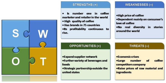 Starbucks Company is the most widely prolific marketer and retailer of coffee in the world. The company has branches in 75 countries, with more than 254,000 employees. The company also sells different types of coffee and tea products and has a licensed trademark. The company offers food, in addition to coffee, and this makes it an attractive spot for snacks and breakfast. The company has different competitors, such as Caribou Coffee Company, Costa Coffee, Green Mountain Coffee Roasters and many others. To face competition, a group of experts perform Starbucks SWOT analysis, as shown in Figure 5. Depending on the SWOT factors and sub-factors, a set of alternatives strategies is developed. Our aim was to prioritize the strategies suggested by company indicators.