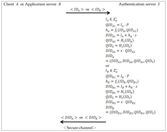 In the key extract phase client and the application server separately submit their identities and to the authentication server and receive their corresponding private keys and , respectively. The key extract phase is depicted in Figure 1. To the client as an example, the detailed procedures are presented as follows: