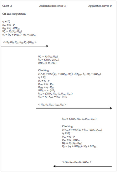 Suppose that the client would like to communicate with the authentication server and request services or applications from the application server . As depicted in Figure 2, the detailed interactions between the three participants are presented as below: