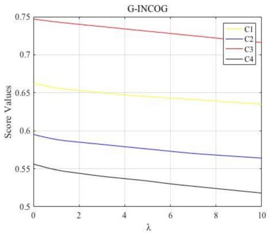 Combined with the proposed approaches for MADM with interval neutrosophic information, we can obtain their score function values of four alternatives, the ranking results for different values of determined by the G-INCOA and G-INCOG operator are shown in Figure 1 and Figure 2, respectively. As shown in Figure 1 and Figure 2, the best choice is always and the worst alternative is always , which means they have higher accuracy and greater reference value. Besides, the changing trends of decision results with parameter calculated by the G-INCOA operator presents an increasing trend, meanwhile, the changing trends of decision results with calculated by the G-INCOG operator shows a declining trend, which further validates the duality of the proposed operators.