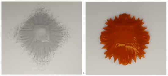 Non-Newtonian fluid does not have a constant ratio between shear rate and shear stress, which means it is unpredictable in how its shear stress changes according to the shear rate with the fluid’s own characteristics. In this paper, we focus on the pseudoplastics fluid, in which the viscosity decreases as the shear increases. In contrast to Newtonian fluids model, shear-thinning fluid’s behavior is not stable. Once the viscosity changes, the fluid structure changes, that is, the changing viscous force causes the molecules or particles to be reordered. Therefore, the essential difference between Newtonian and non-Newtonian fluids is the viscosity (as shown in Figure 1). In this paper, shear-thinning non-Newtonian fluid is modeled by the control equation with Cross Model (see Section 3.2). Figure 2 shows the simulation effect of Newtonian fluid and non-Newtonian fluid. From the picture, the edge of Newtonian fluid appears splash while non-Newtonian fluid does not have this phenomena for its high viscosity. Note that we do not consider the effect of temperature and elastoplastic.