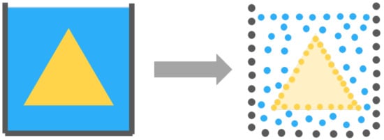 The SPH scheme is essentially a method of interpolation of weight functions []. This method interpolates approximate calculation of the physical properties of fluid particles, such as mass, velocity and pressure. The continuous integral formula can be approximated into a summation formula by dividing the continuous fluid into N small particles. The assumption behind this is that each particle has independent mass and occupies the independent space.