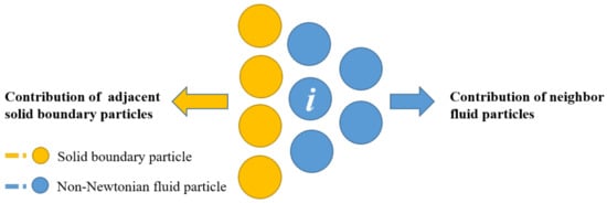 is non-Newtonian fluid particle i. is the solid boundary particle k. As shown in Figure 4, the first sum item in Equation (13) is the sum of all the neighbor fluid particles of non-Newtonian fluid particles. The second sum item is the sum of all the adjacent solid boundary particles. This method can improve the boundary defect of the SPH method.