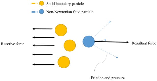Considering the non-Newtonian fluid, such as features of bending, rotation and the Weissenberg effect, we add friction boundary conditions to constrain non-Newtonian fluid particles at the boundaries []. This is to realize the viscous characteristics of non-Newtonian fluid at the boundary.