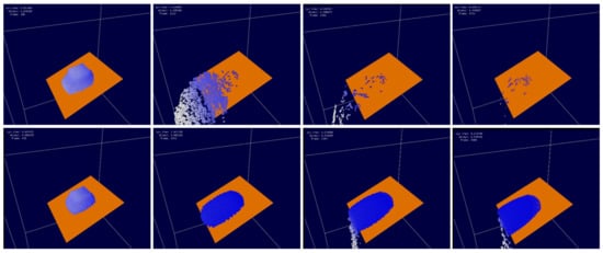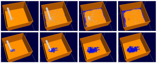 The second experiment is the friction boundary comparison of non-Newtonian fluid, as exhibited in Figure 7. The upper row shows the fluid volume flows along a slant board without friction boundary constraints. The fluid volume flows quickly after contact with the board. In about 8 s, the fluid particles all crept down. From the lower row, The boundary has a good constraint on the fluid particles with the friction conditions, so the flow process was slow and the fluids kept better viscous characteristics. Table 1 enumerates the experimental parameters and settings.